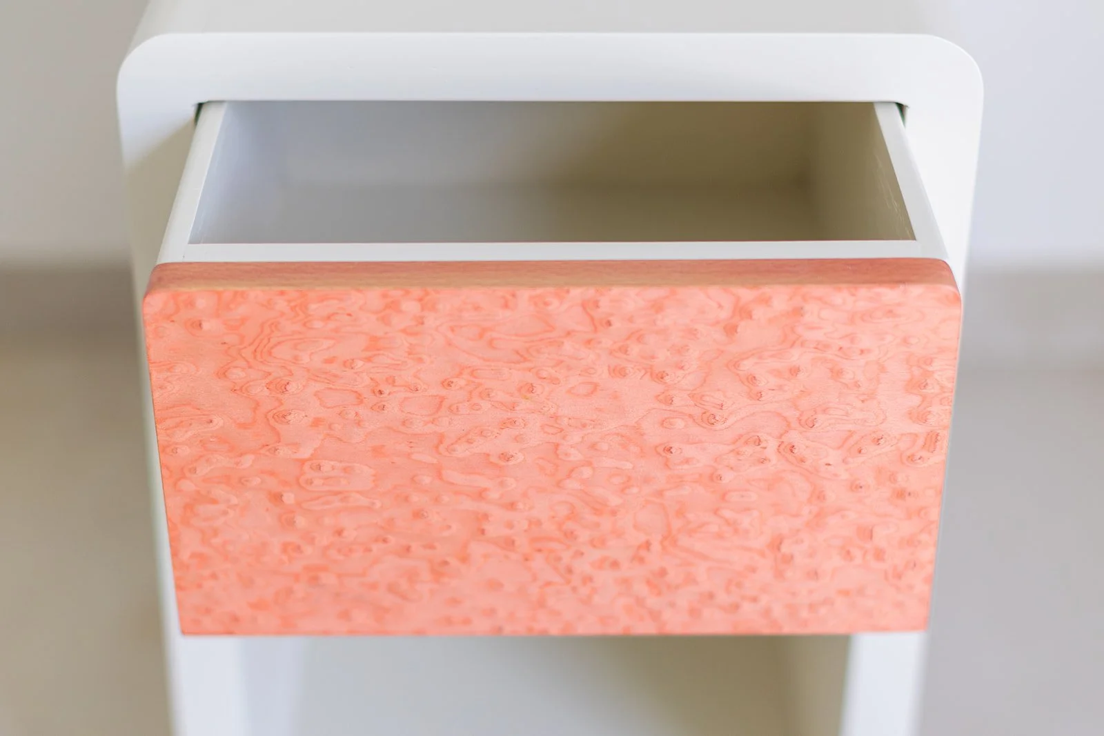 Una mesita hecha en madera maciza lacada en color crema con frente de cajón rechapado en raíz de roble teñido en color rosa. Se trata de un diseño moderno y funcional, un toque original para un dormitorio con personalidad.